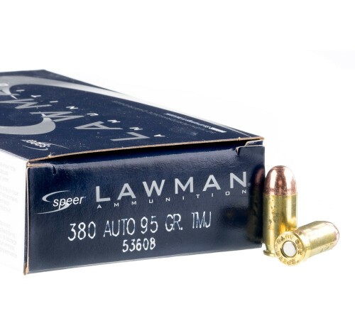 Lawman rounds use “total metal jacket” plating which covers the entire bullet in copper. This renders the bullet unsuitable for ported barrels, which can shear the copper, but lowers the cost of the ammo and provides some lead hazard protection for the shooter. Expect muzzle velocity of about 950 feet per second from this ammo, just like Gold Dot in .380 Auto. Each cartridge in this box of 50 uses Boxer-primed reloadable brass cases.